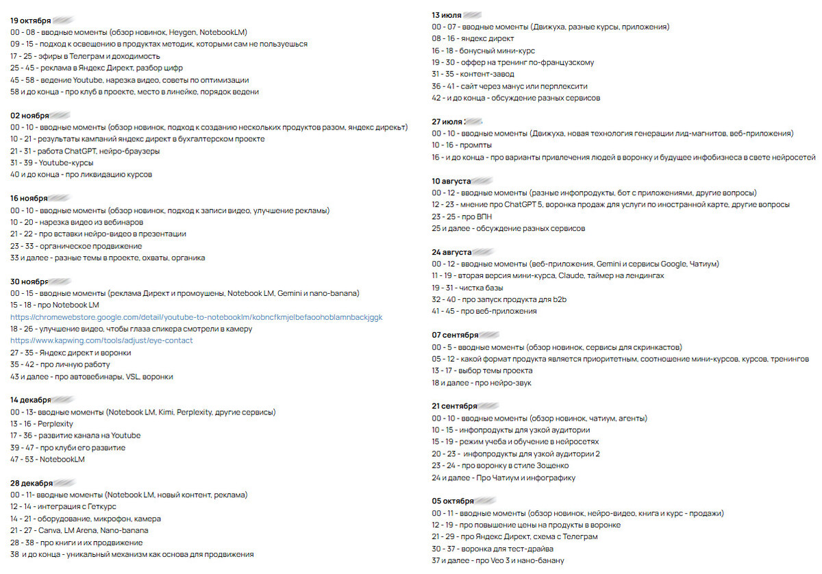 Среди разбираемых тем: самые разные нейросети и их использование в проекте, воронки и запуски, реклама, копирайтинг, взаимодействие с базой, создание инфопродуктов, разборы лендингов и писем, решение возникающих проблем, правовые вопросы, делегирование, организация распродаж, структура офферов, продажи на вебинарах, внедрение автовебинаров, изучение аудитории и так далее.