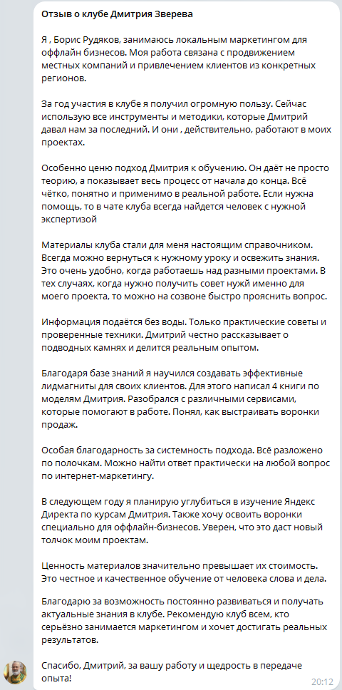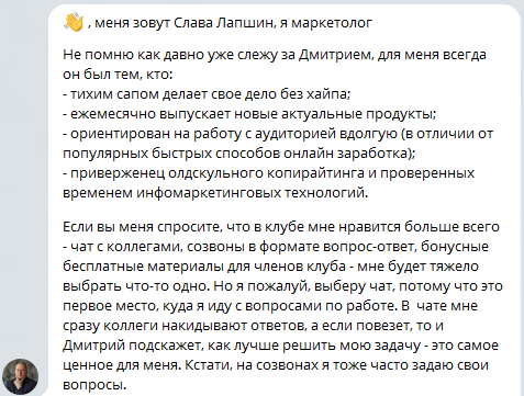И еще один отзыв от участникам клуба Дениса Платонова с акцентом на важность нахождения среди коллег: