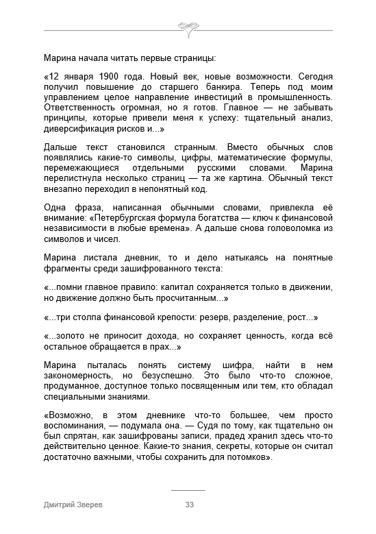 — Я не понимаю, зачем вам расшифровывать какой-то дневник столетней давности? — скептически спросил Александр Волин, разглядывая Марину поверх массивных очков в своём захламлённом офисе на Васильевском.