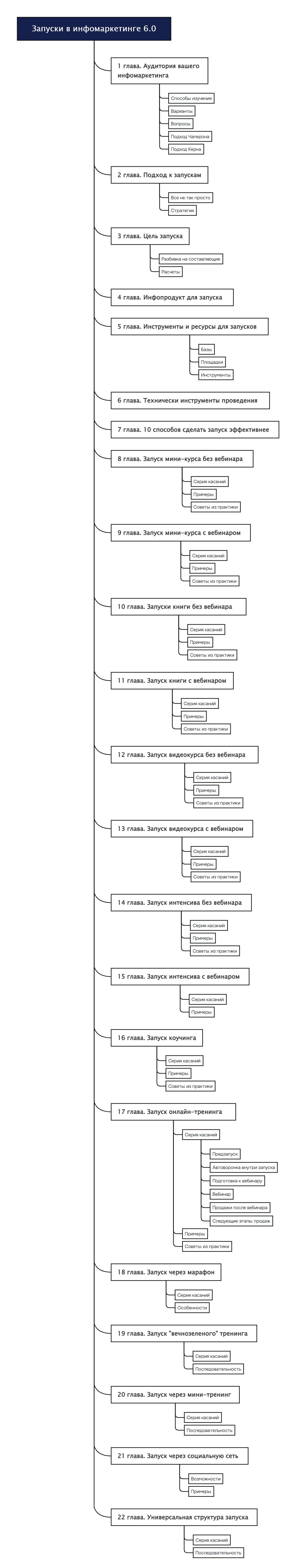Особенность данной книги состоит в том, что я даю комплексную информацию по запускам всех основных форматов инфопродуктов: онлайн-тренинга, коучинга, интенсива, видеокурса, книги, мини-курса. И делаю это на основании обобщения огромного массива информации из практики.