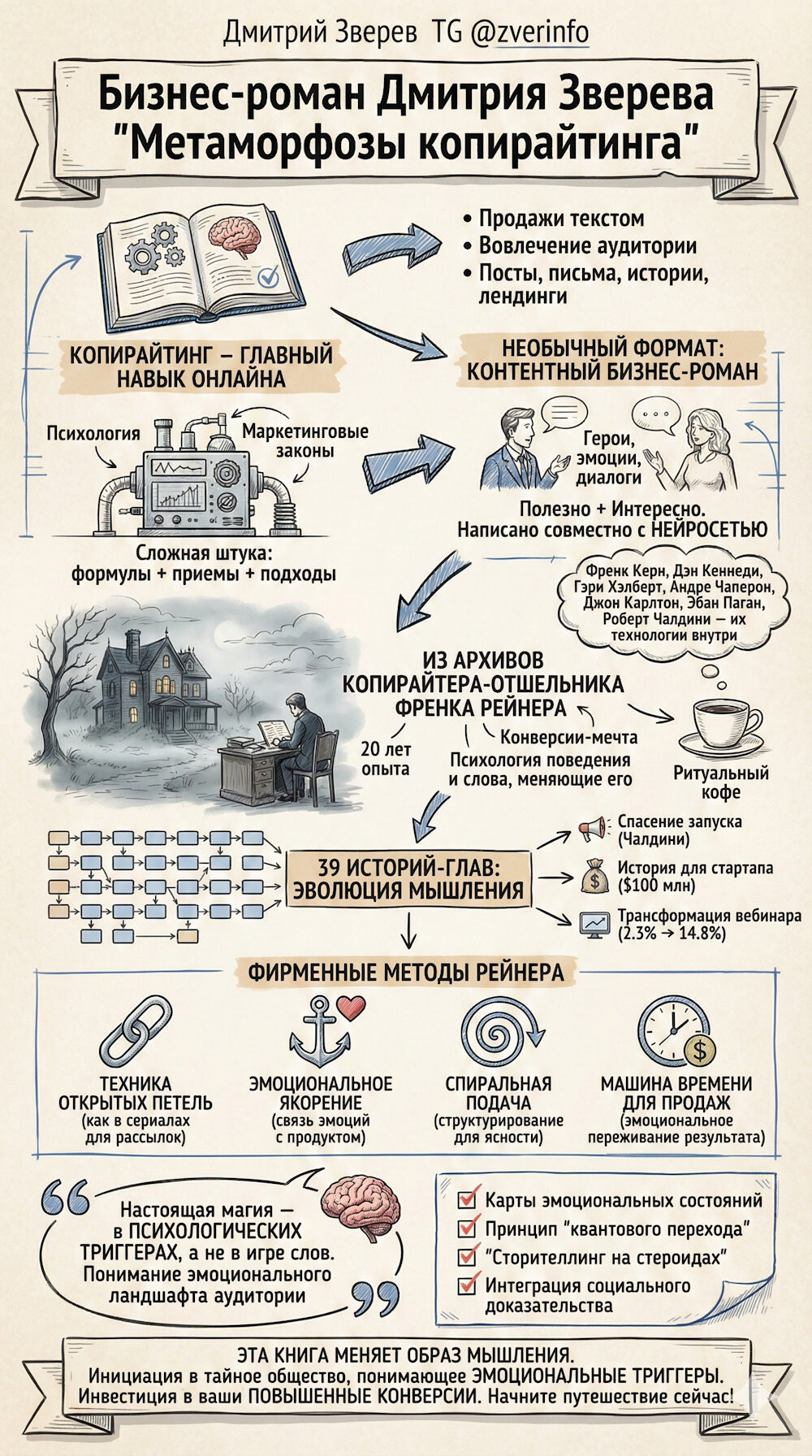 За это время мной записано несколько тысяч видео, созданы сотни страниц и тысячи писем, более сотни платных и несколько сотен бесплатных продуктов, десятки книг, более сотни воронок продаж и рекламных кампаний, проведено множество запусков и релизов, написаны тысячи текстов разных видов, назначения и сложности.