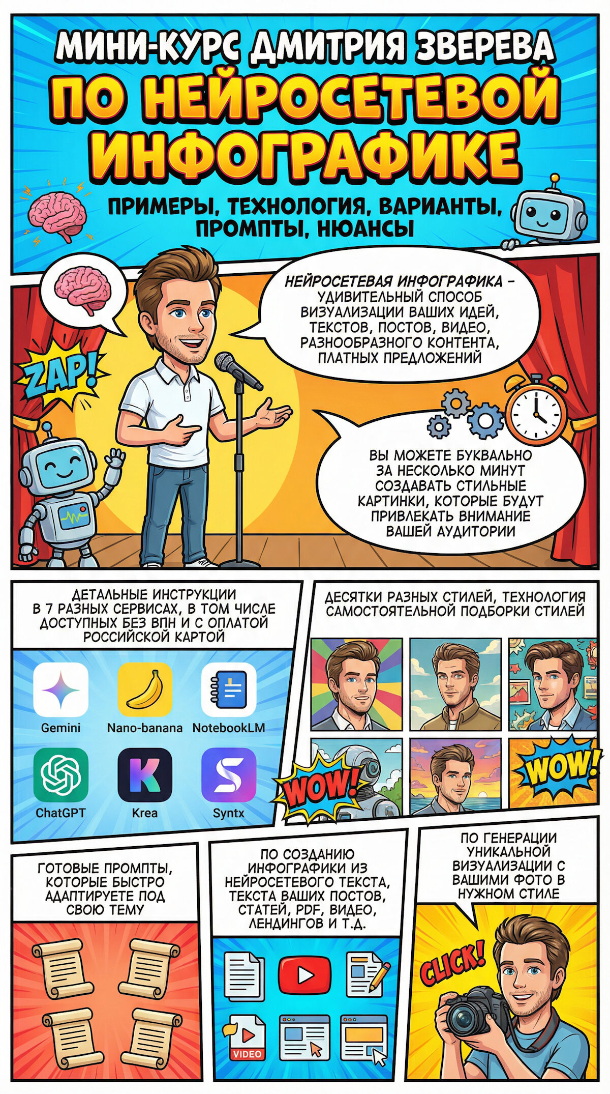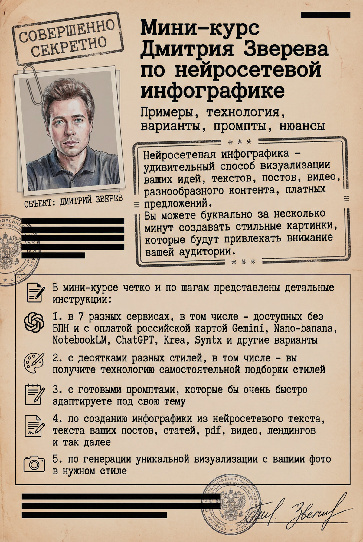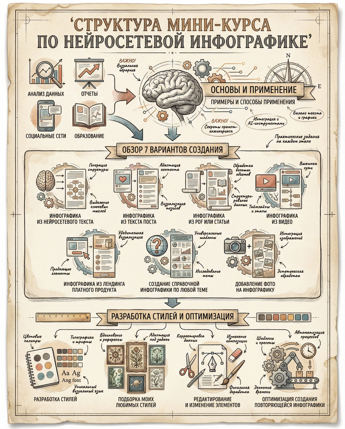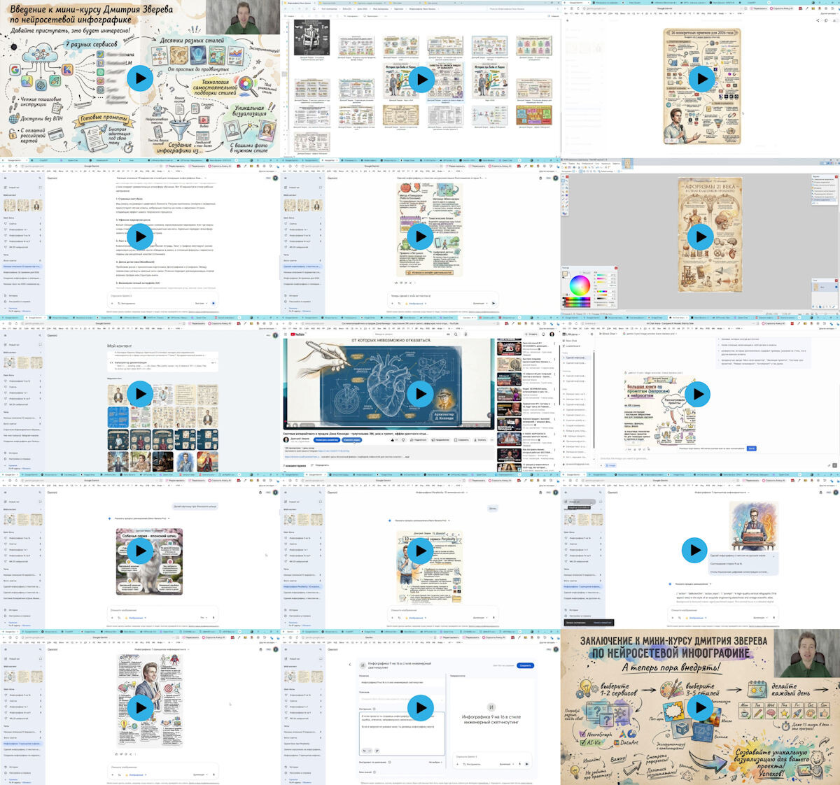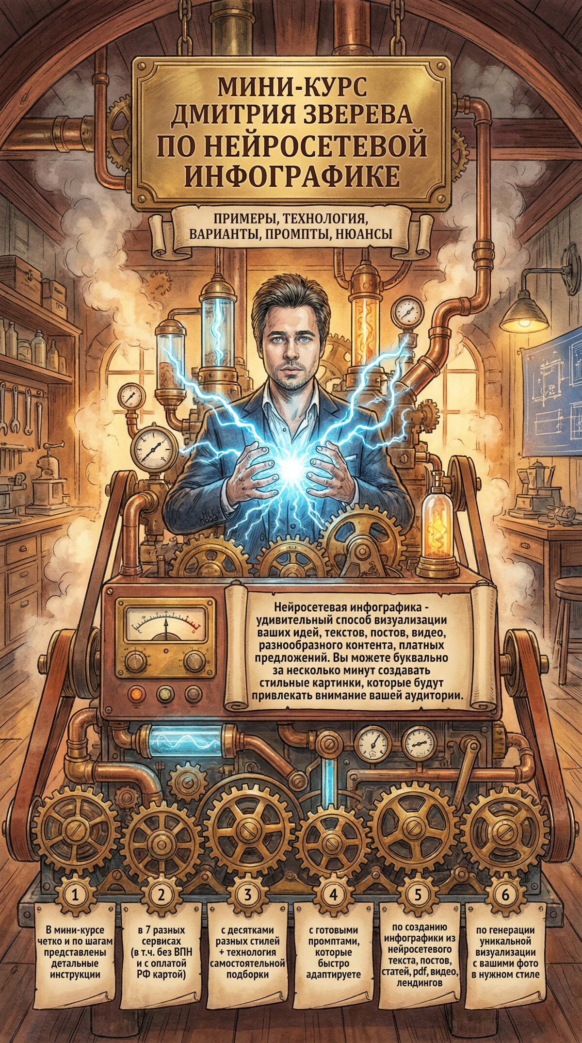 Это большая более чем 20-часовая система с пошаговыми инструкциями по генерации самых разнообразных картинок в разных нейросетях.