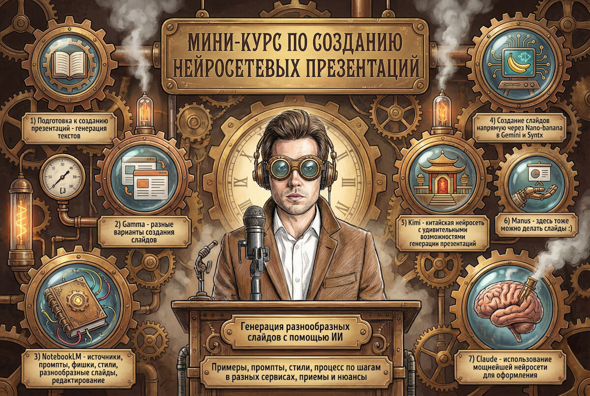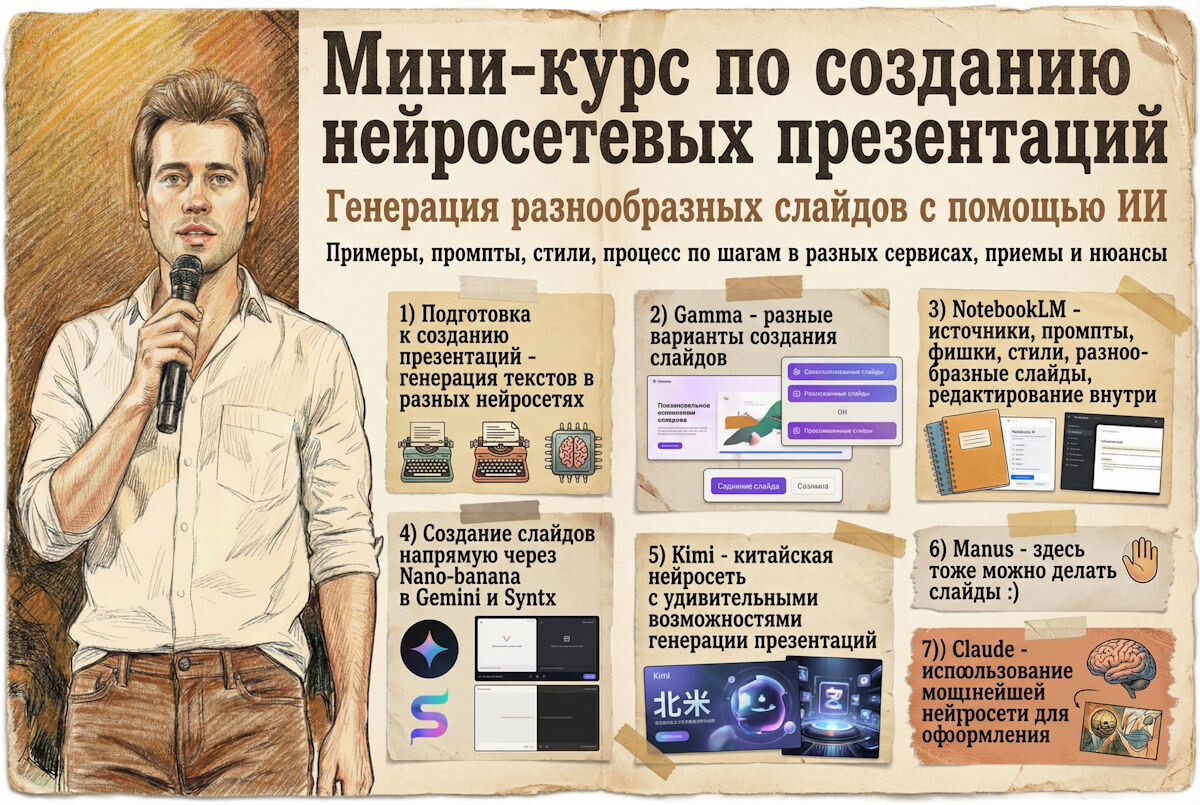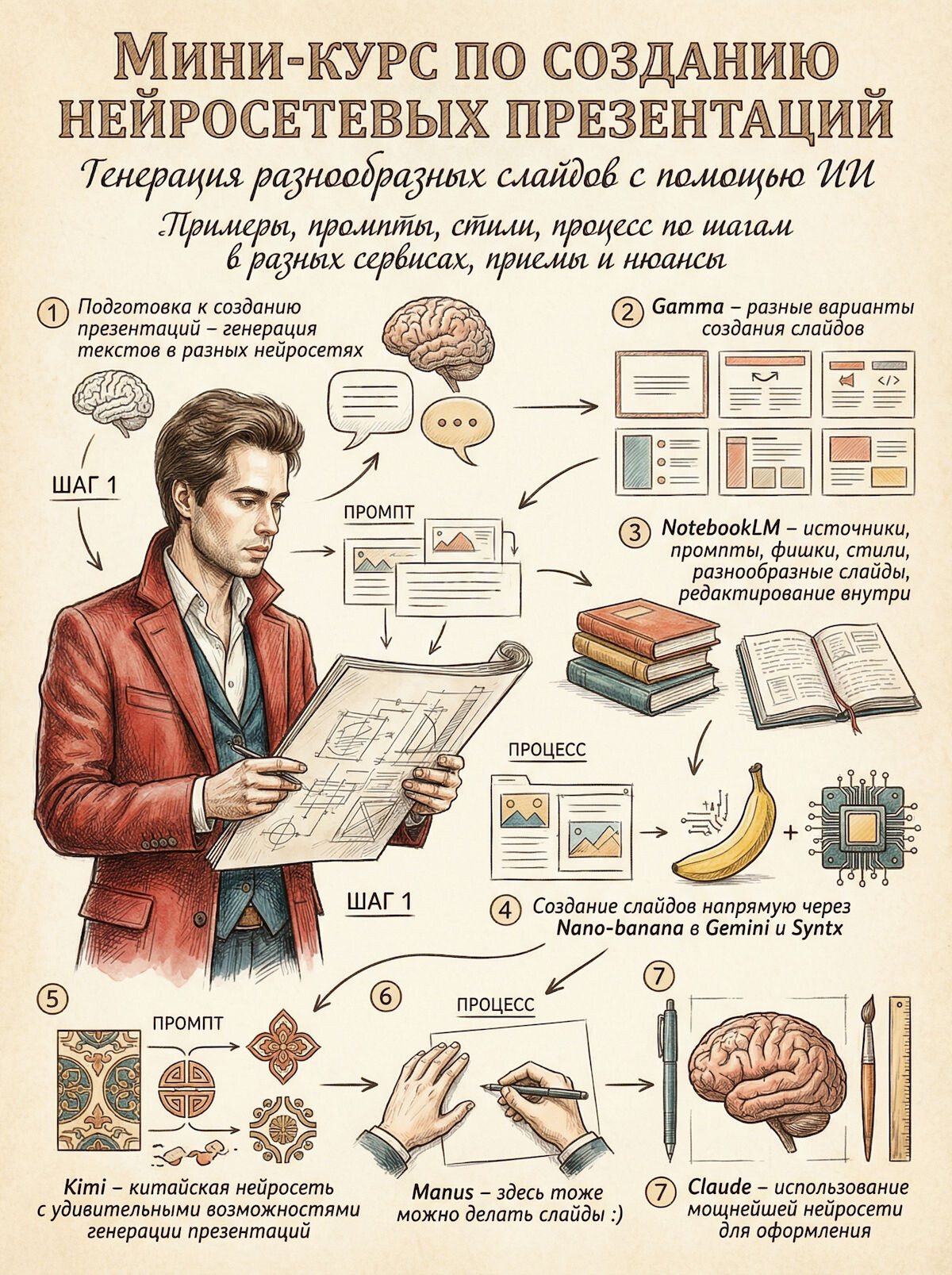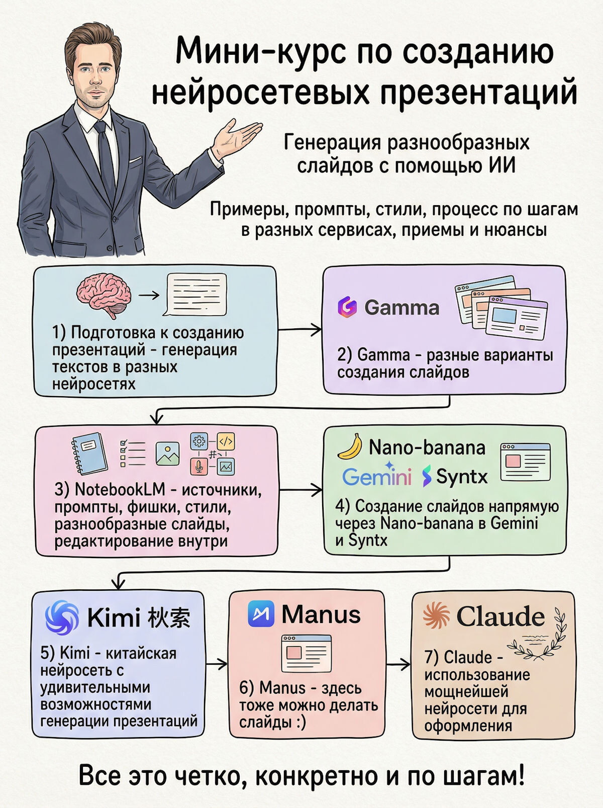 Среди сервисов, про которые говорим: Gamma, NotebookLM, Gemini, Syntx, Kimi, Manus, Claude.