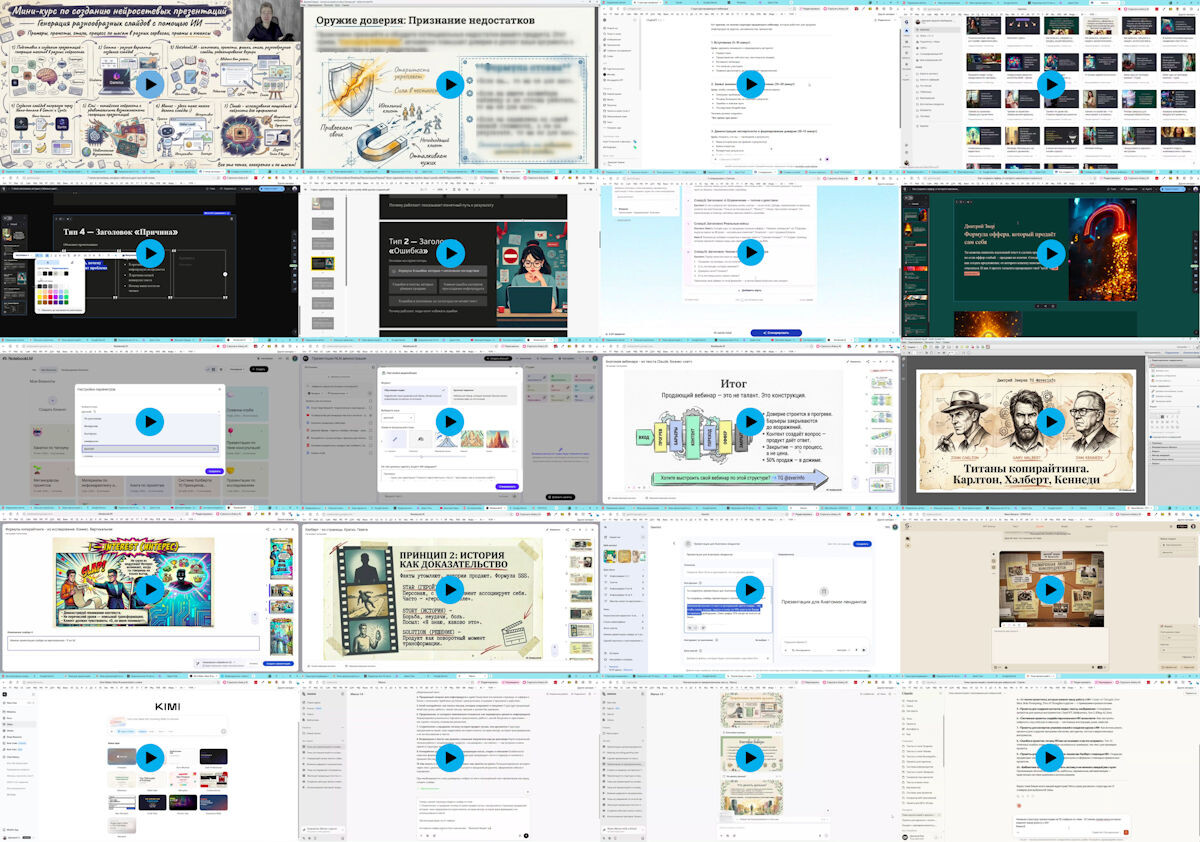 Также вы получите все сгенерированные в рамках курса презентации. Совокупно это более 200 слайдов по актуальным темам онлайн-деятельности в разных стилях: