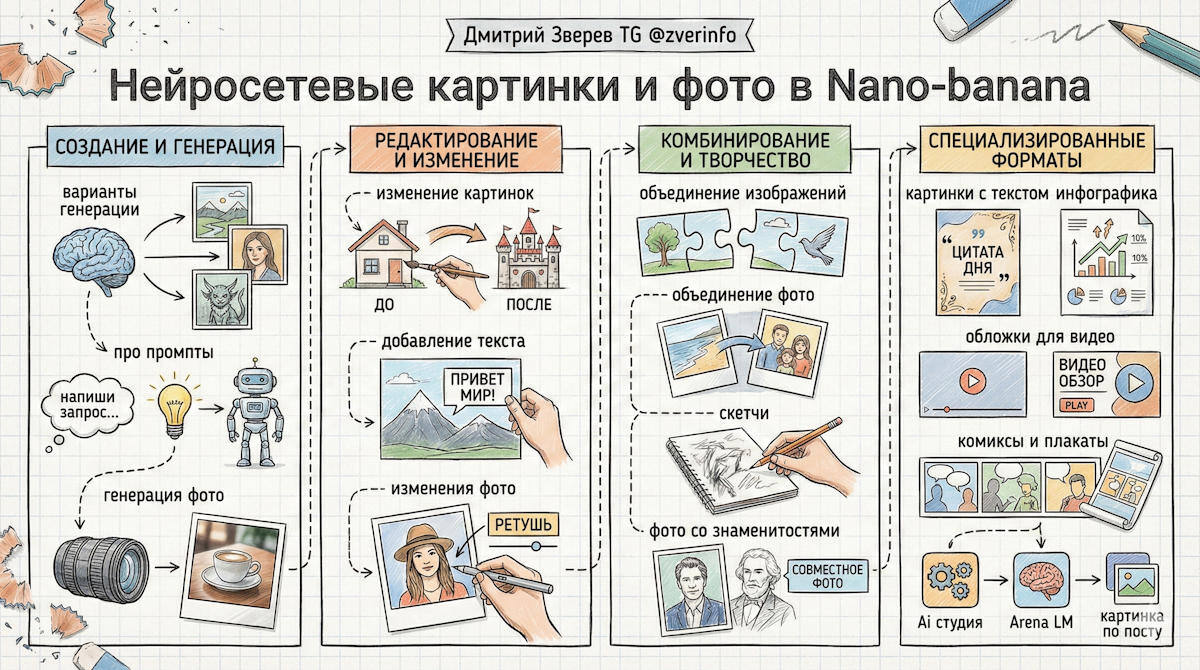 Редактирование и улучшение картинок и фото, объединение картинок и фото, дорисовка сторон. Генерация новых картинок и фото по промпту и по референсу, инфографика, обложки, комиксы и постеры, скетчи и т.д.