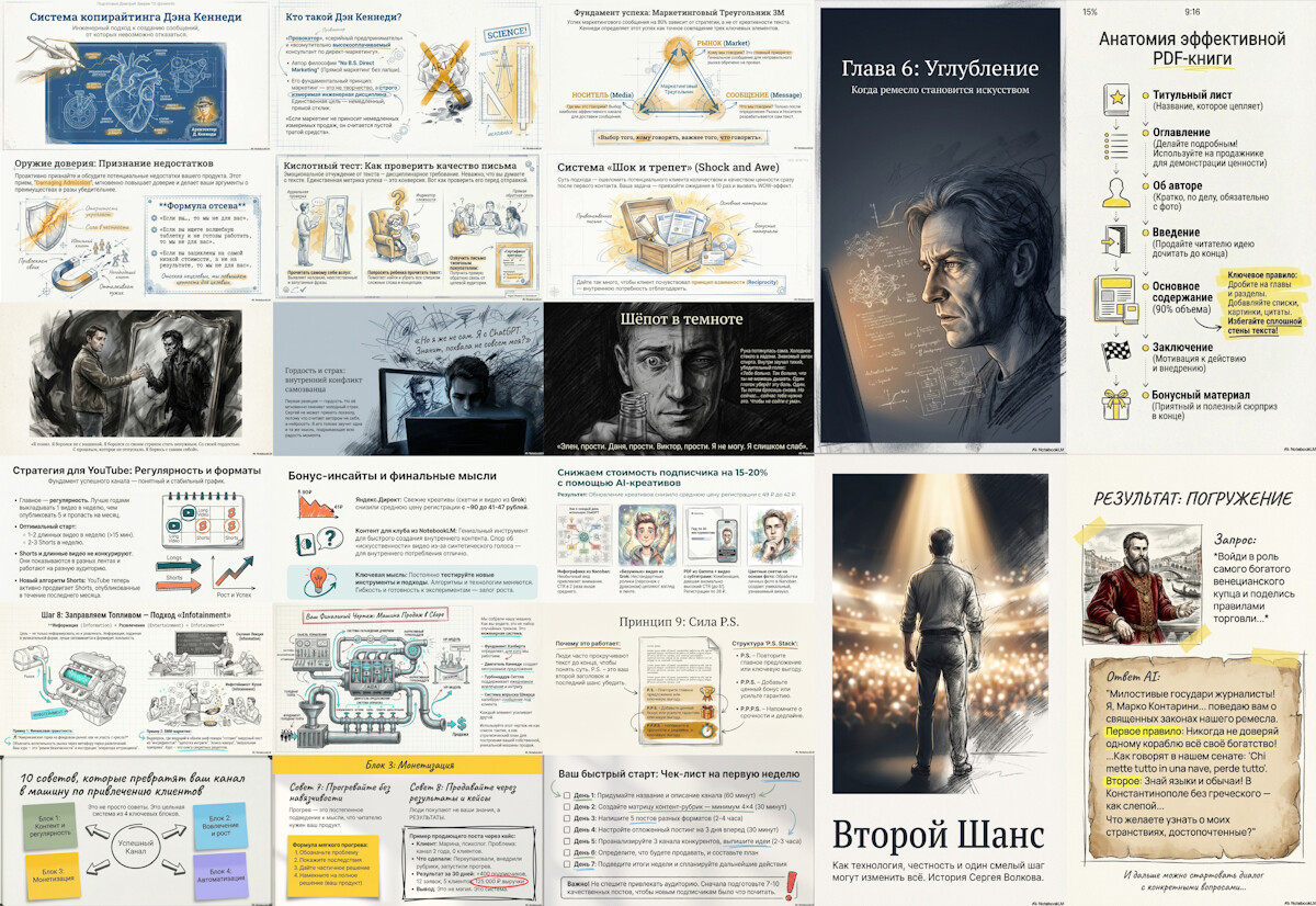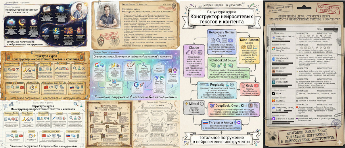Тексты самых разных видов, планы, pdf-отчеты, потрясающие презентации, инфографика, картинки, интеллект-карты, нейросетевые видео и аудио, исследования, нейросетевые веб-приложения и другое