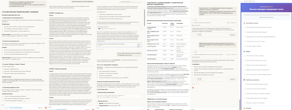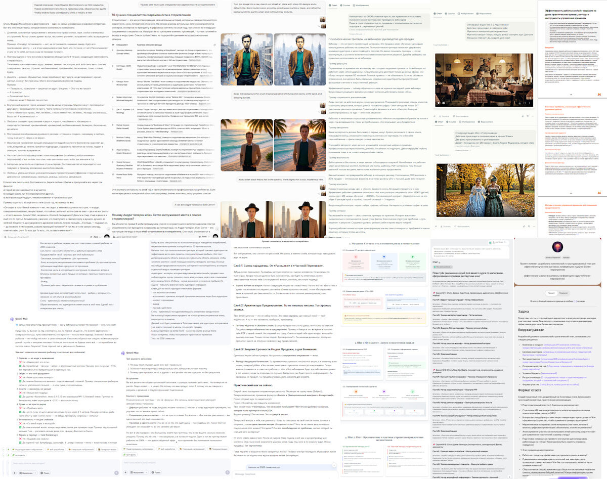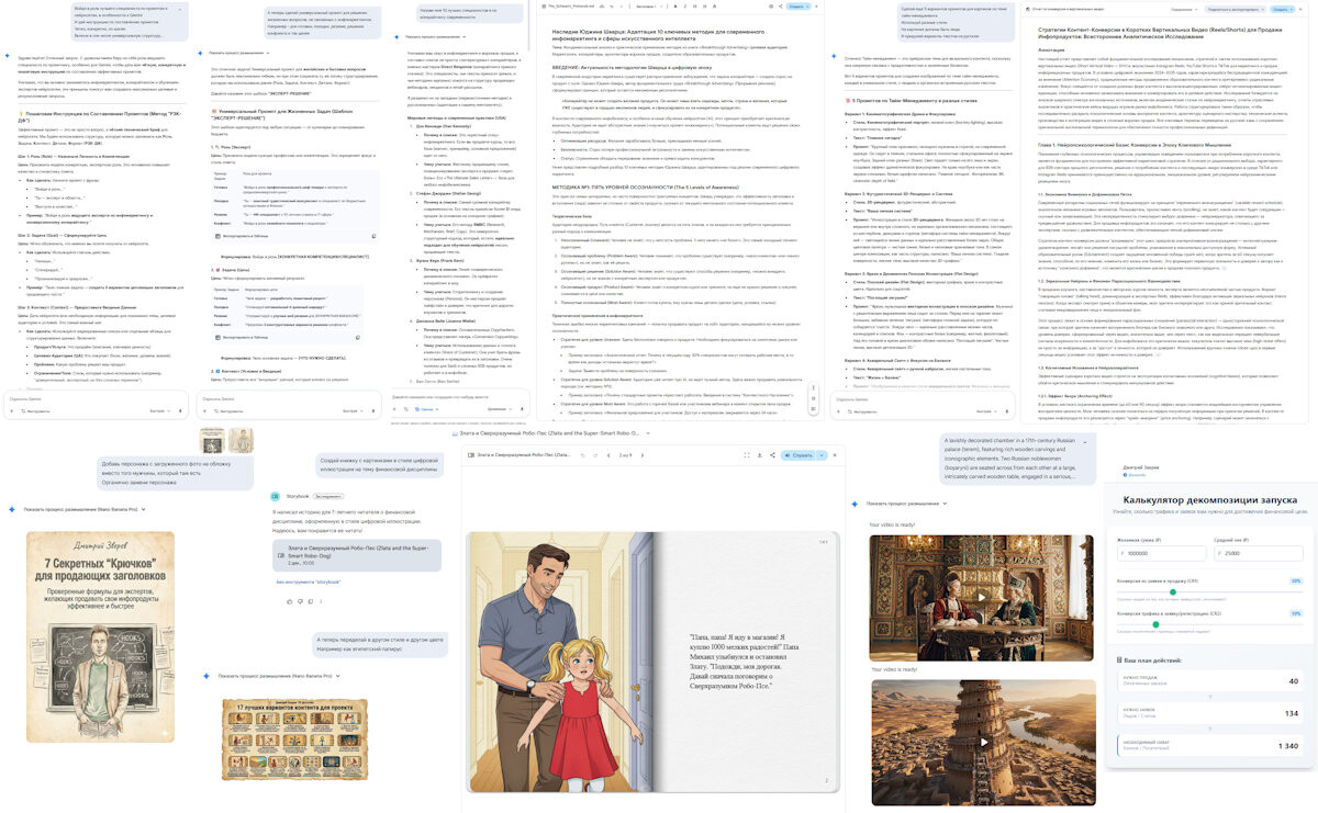 Промпты, заголовки, планы, разнообразные тексты, структура воронок, сторителлинг, DeepResearch, генерация pdf-отчетов, погружение через проекты, нейросетевой код и так далее
