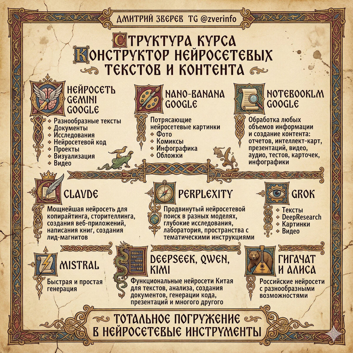 Gemini, NotebookLM, Nano-banana, Claude, Perplexity, Grok, Mistral, DeepSeek, Qwen, Kimi, Гигачат от Сбера, Алиса от Яндекса, сервисы-посредники