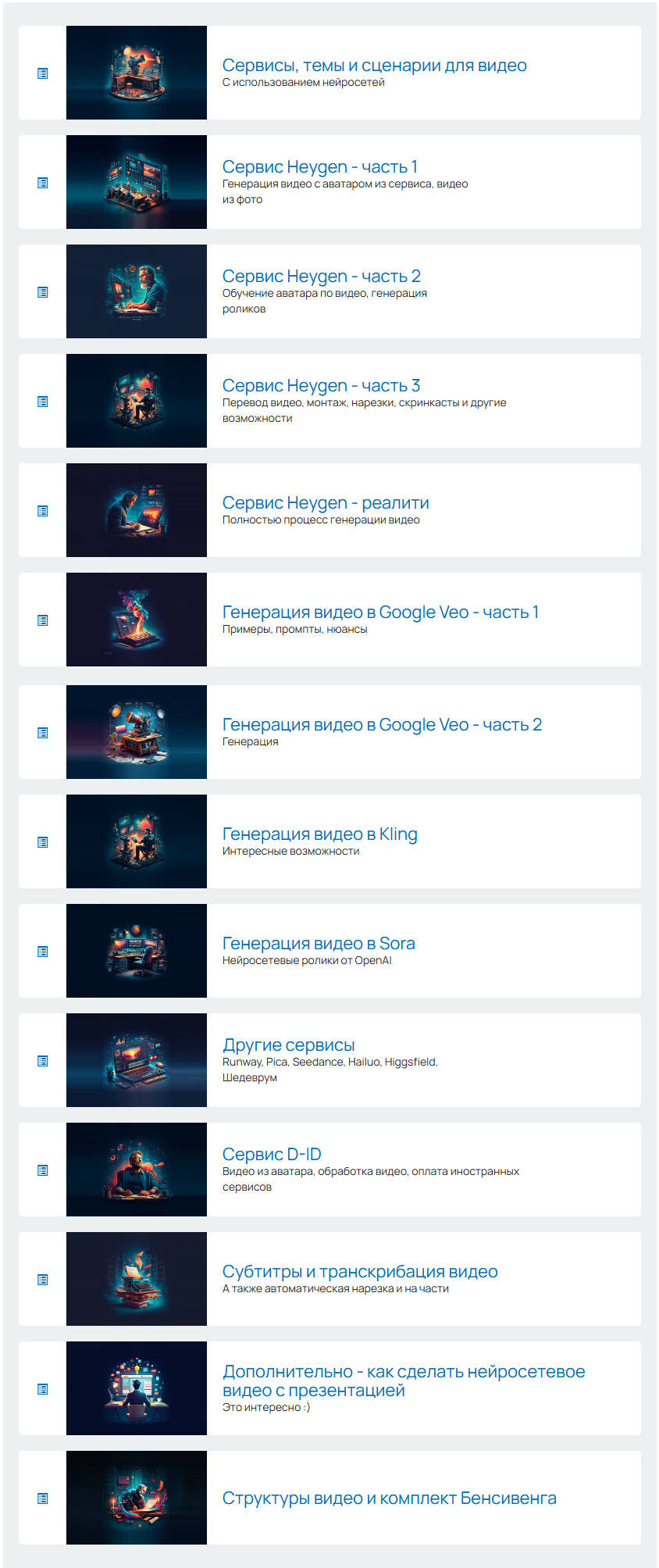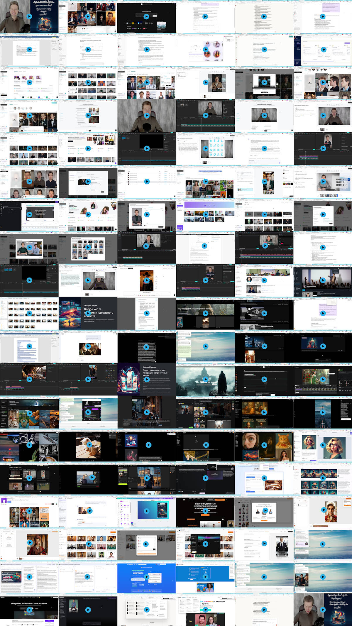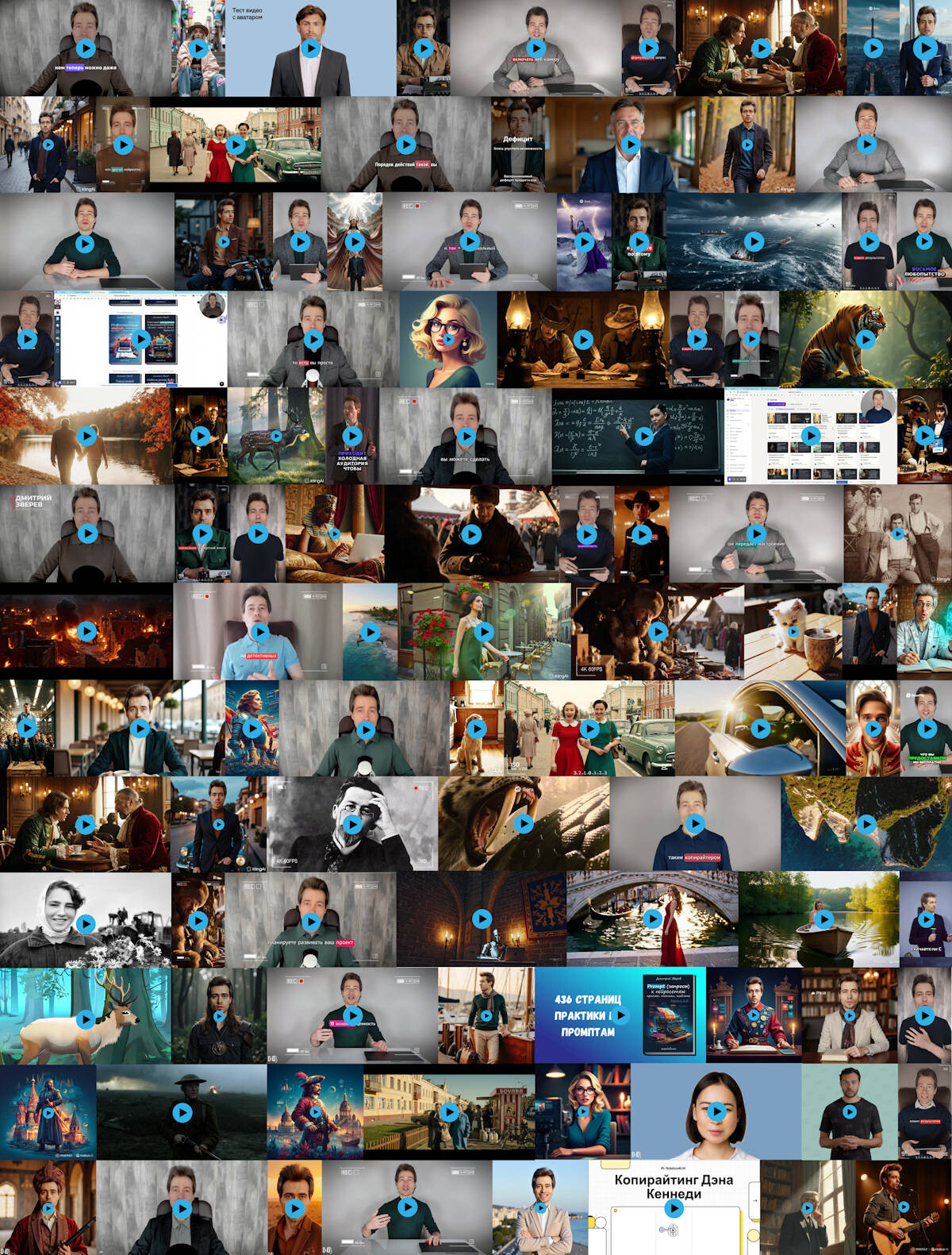 Примеры разных нейросетевых видео, которые вы сможете генерировать в более чем десяти рассмотренных в курсе сервисах (Veo, Kling, Sora, Pica, Runway, Hailuo, Seedance, Higgsfield, Krea, D-ID, Midjourney, NotebookLM, Opus, Syntx и другие инструменты