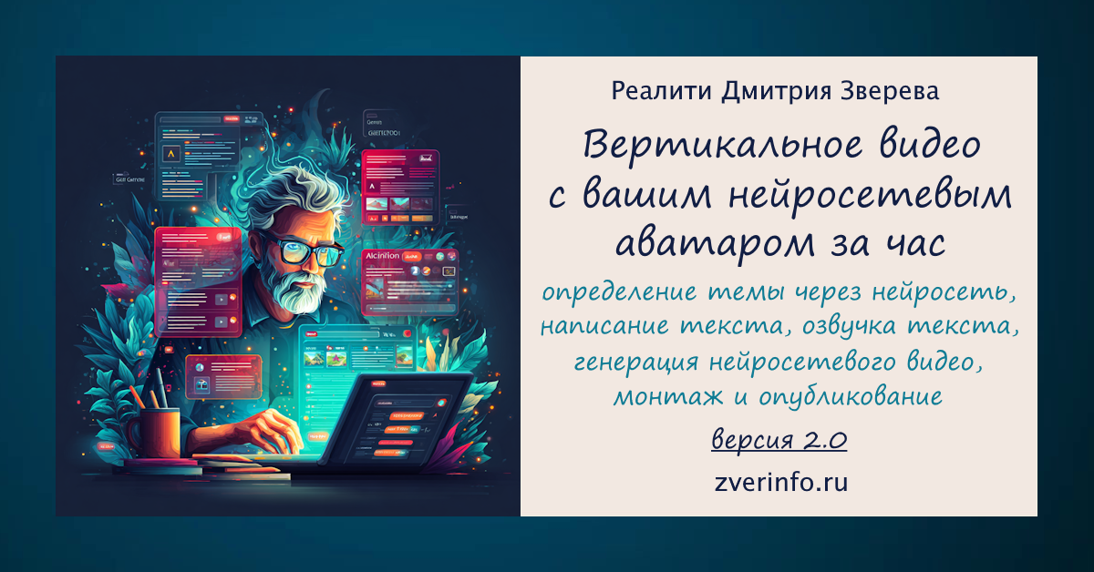 Реалити с полной демонстрацией с нуля создания нейросетевого вертикального видео с аватаром: генерация темы, текста, запись аудио, генерация видео, монтаж, размещение ролика на разных площадках.