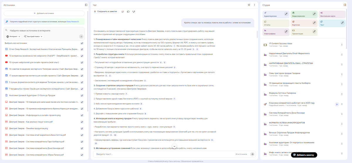 Система очень умная, она работает на базе Gemini от Google и может справляться со сложнейшими задачами даже в специализированных темах. Так, у меня есть клиент в сфере бухгалтерии, который загружает в NotebookLM нормативные акты по своему направлению и система генерирует уникальные памятки, помогает в определении нужной нормы и так далее.