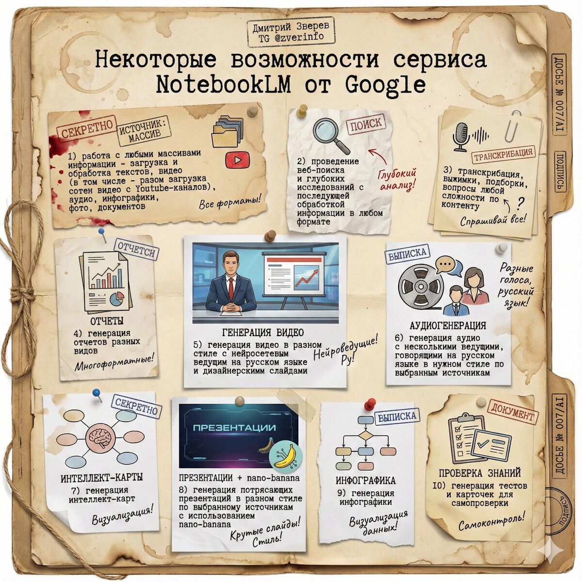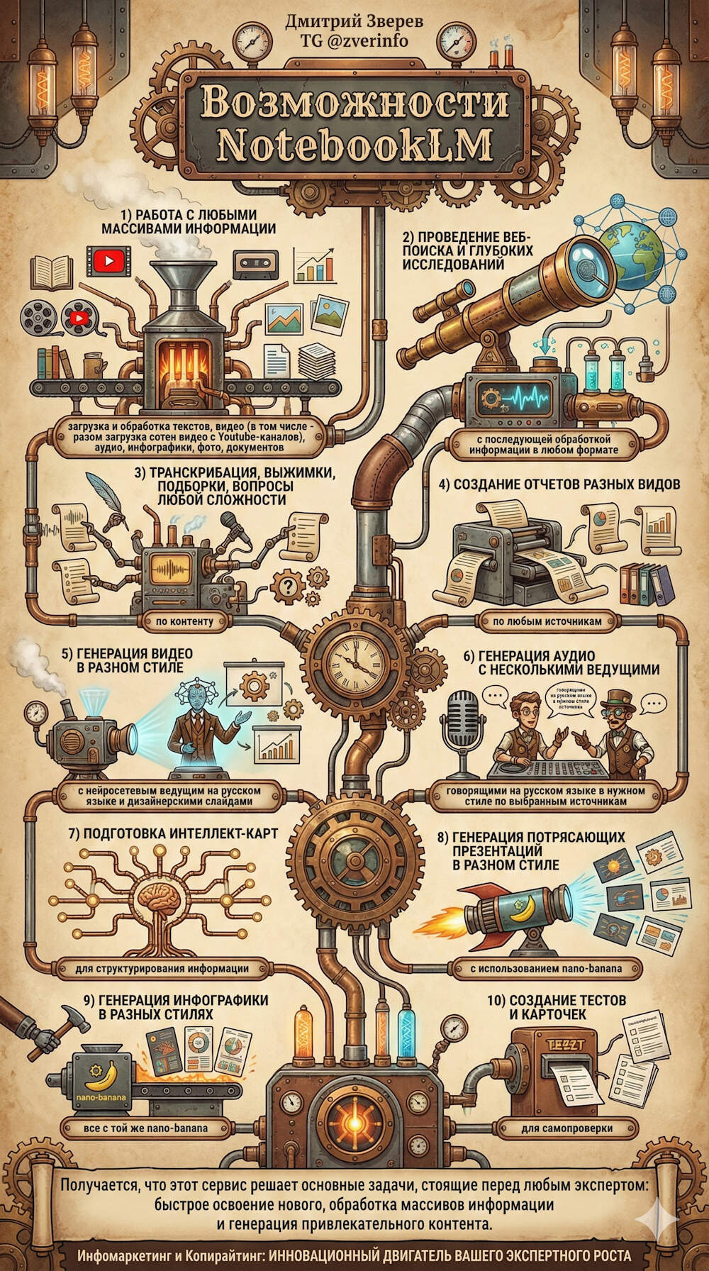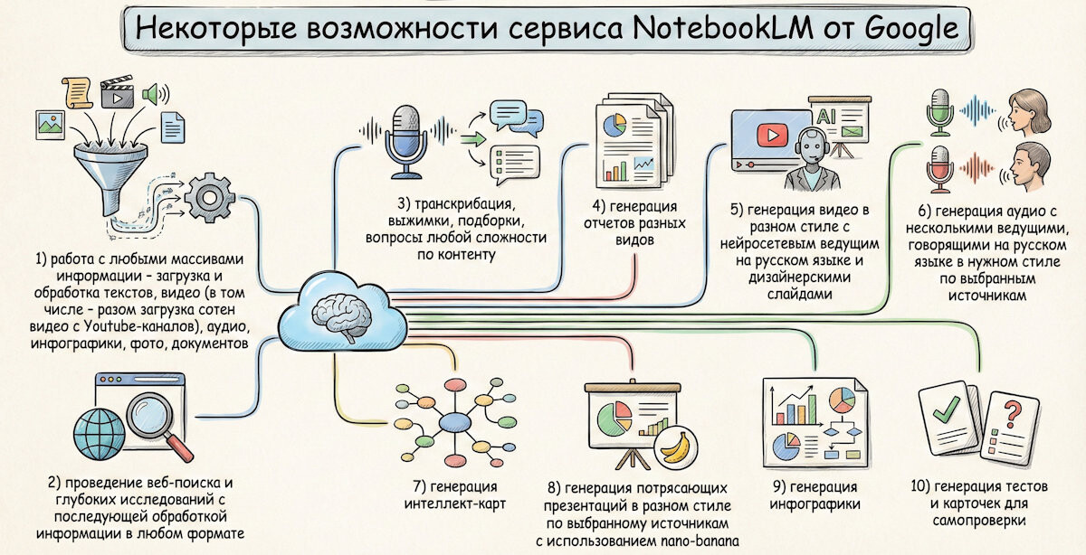Быстрое изучение и обработка любых объемов информации и генерация по ним разнообразного контента: отчетов, невероятных презентаций Nano-banana, инфографики, интеллект-карт, аудио и видео с нейро-ведущими, тестов и так далее