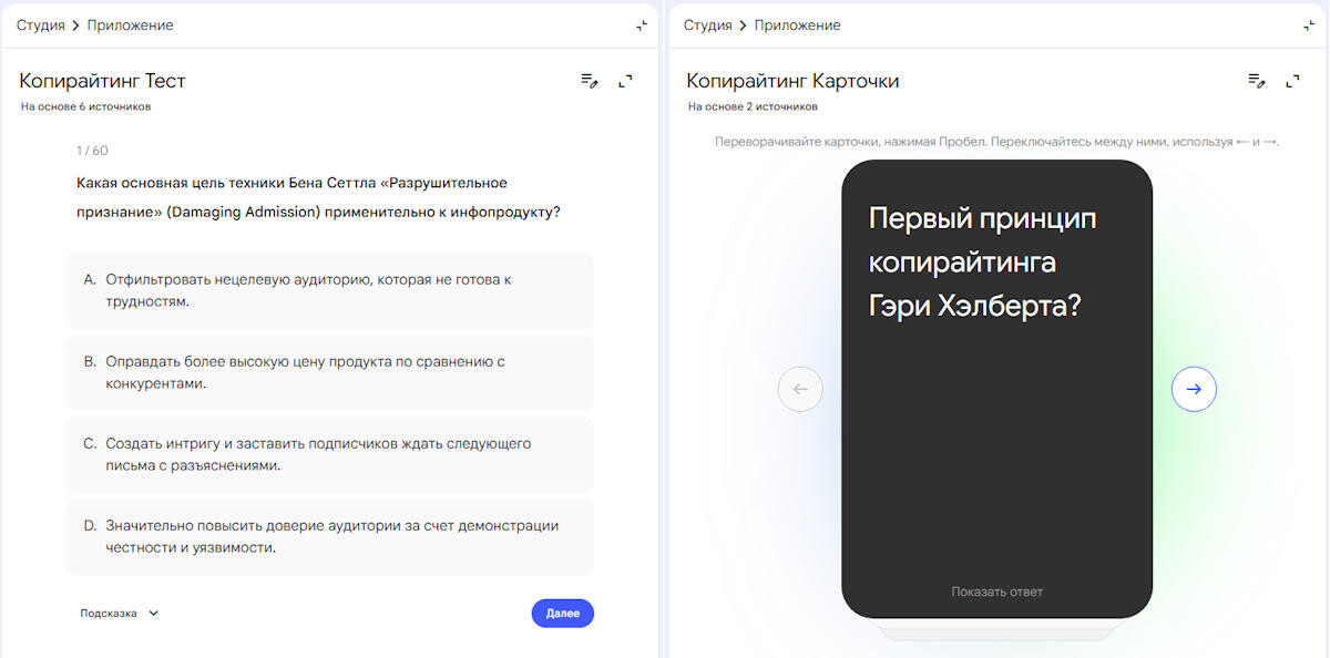 3) и самое интересное - внутри сервиса есть Студия, которая позволяет генерировать по загруженным источникам разнообразный контент. И делает это просто невероятно: