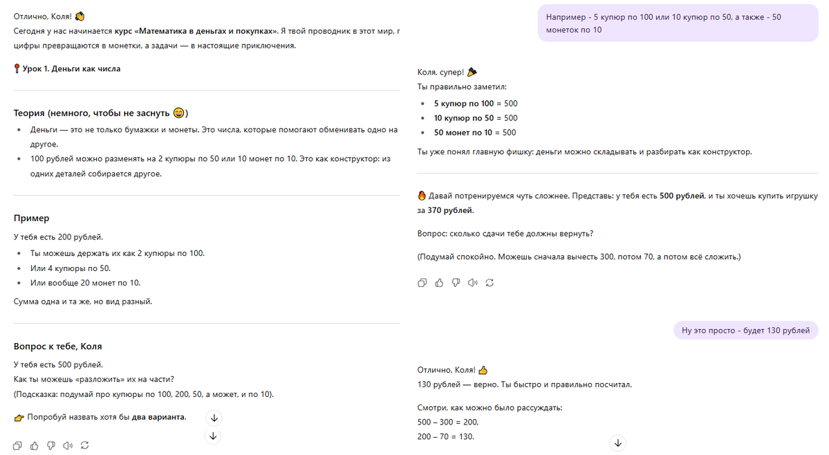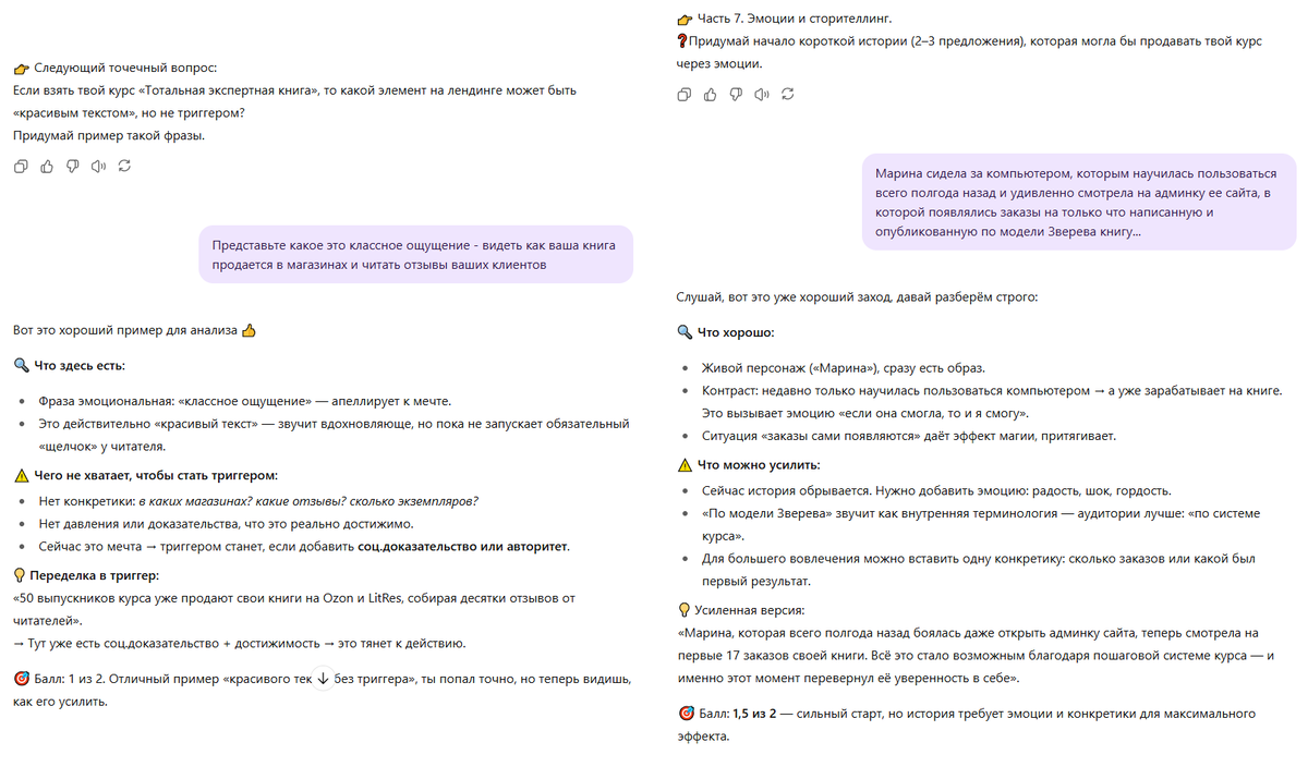 А ниже несколько примеров взаимодействия с чатом в режиме обучения (конечно - это лишь маленькие кусочки, сами курсы могут занимать десятки, сотни или даже тысячи страниц переписки - глубина такая, какую вы сами настроите).