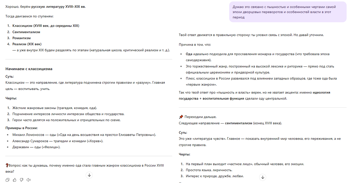 - Метод Сократа: диалог ведётся в стиле репетитора и часто включает просьбы объяснить ваш ход мыслей, формулирует встречные вопросы и помогает искать ответ самостоятельно.
