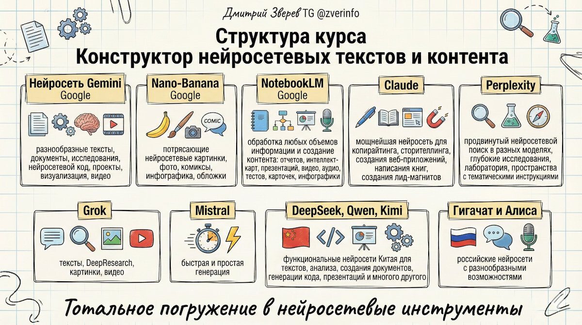 Gemini, NotebookLM, Nano-banana, Claude, Perplexity, Grok, Mistral, DeepSeek, Qwen, Kimi, Гигачат от Сбера, Алиса от Яндекса, сервисы-посредники