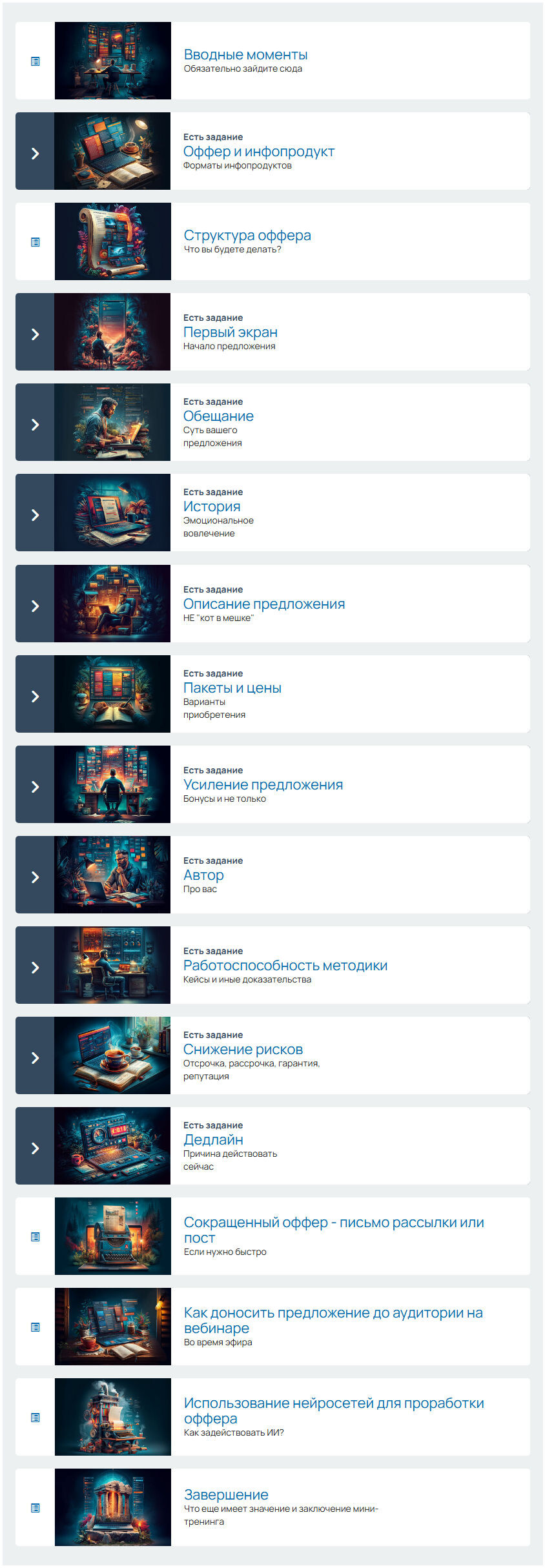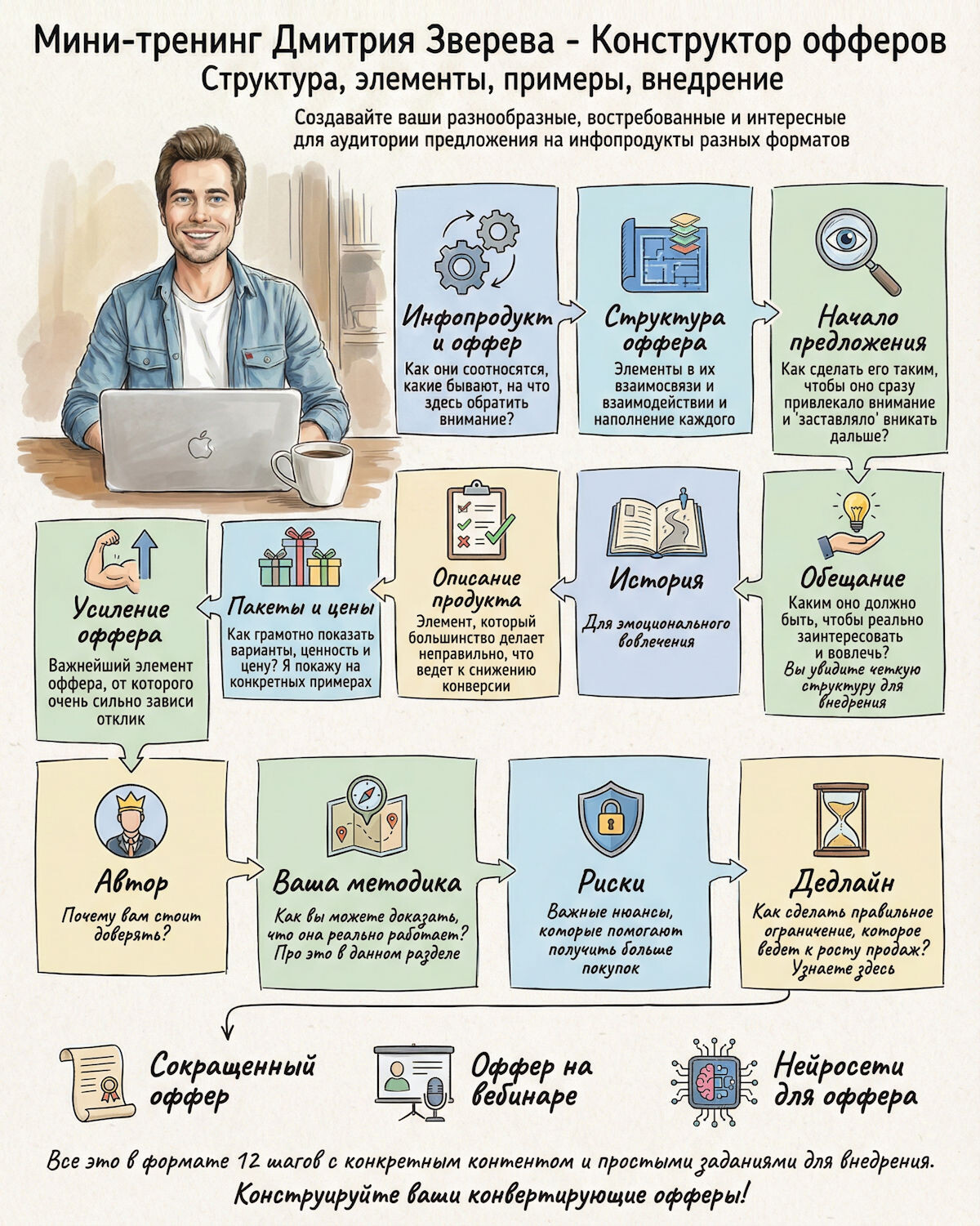 2. Материалы тренинга разбиты на 12 шагов, которые представлены на картинке ниже. Каждый из этих шагов посвящен одному из элементов оффера.