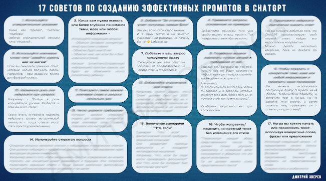 Подготовил для вас наглядный 29-страничный pdf-отчет с 11 конкретными фишками - приемами для результативного внедрения ChatGPT в вашей деятельности. И приложил к нему наглядную картинку с 17 советами по составлению промптов.