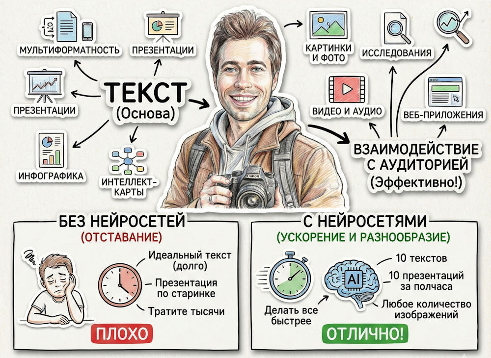 Потому что в текущих реалиях особое значение играет мультиформатность, где текст выступает как фундамент, а дополнительно к нему мы создаем: