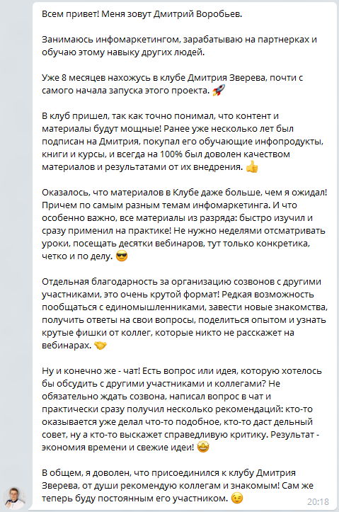 Именно так работает мой клуб Тотальный инфомаркетинг, который объединяет более 150 интернет-предпринимателей и существует уже более 3,5 лет. Такой длительный период является редкостью для клубов и доказывает эффективность используемой методики: