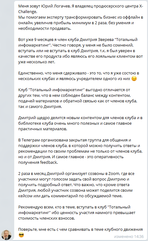 Доступ в клуб Тотальный инфомаркетинг на 8 месяцев, в том числе - 16 групповых созвонов в Зуме с общением голосом.
